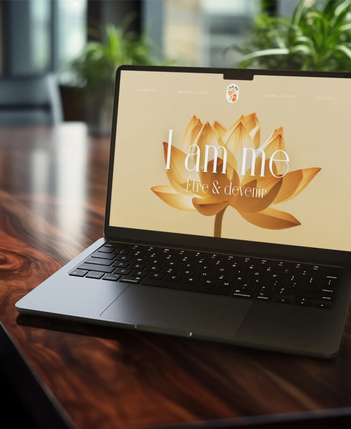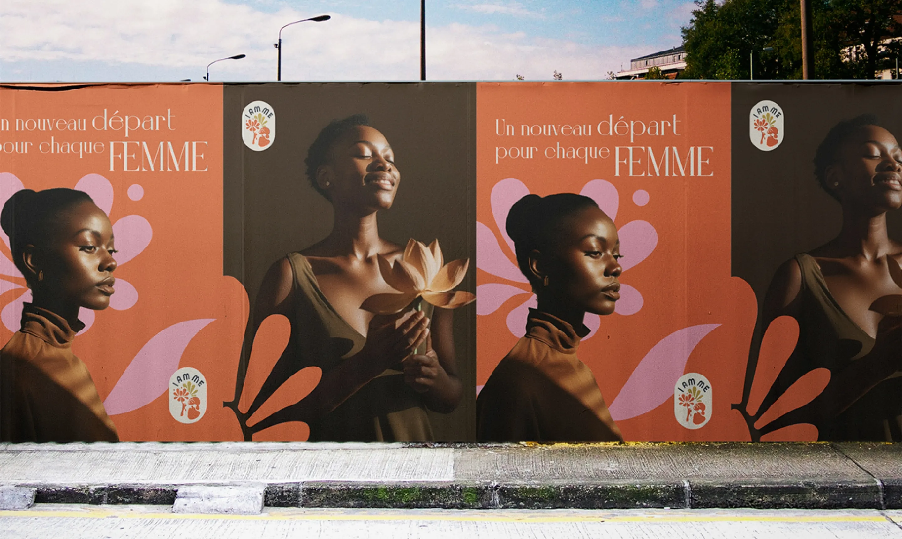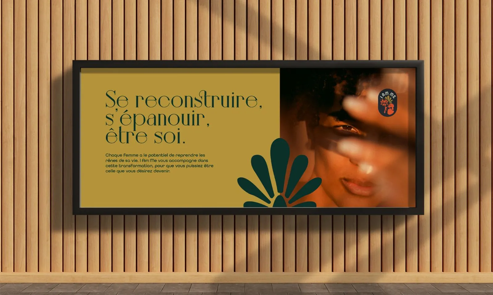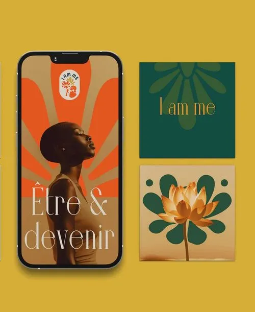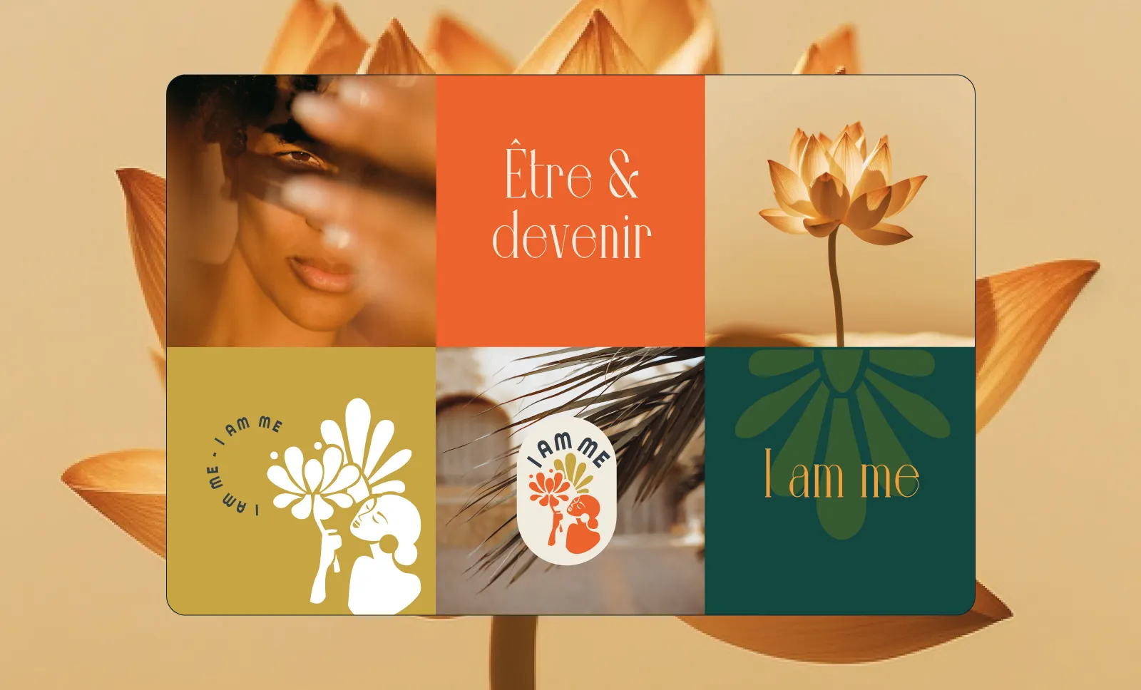 La nouvelle identité visuelle de I AM ME capture l'essence de la transformation et de la résilience des femmes qu'elle accompagne. Les couleurs choisies symbolisent l'espoir et le renouveau, tandis qu'une typographie élégante à empattement incarne à la fois la stabilité et l'évolution personnelle au sein de l'association. L'univers graphique allie des photographies aux tons beiges et bois, renforçant la dimension humaine et authentique, avec des illustrations aux couleurs vives et aux formes arrondies qui traduisent la chaleur et le soutien offerts par **| AM ME**. Le lotus, symbole puissant de renaissance, est au cœur de cette identité, représentant parfaitement la mission de l'association :