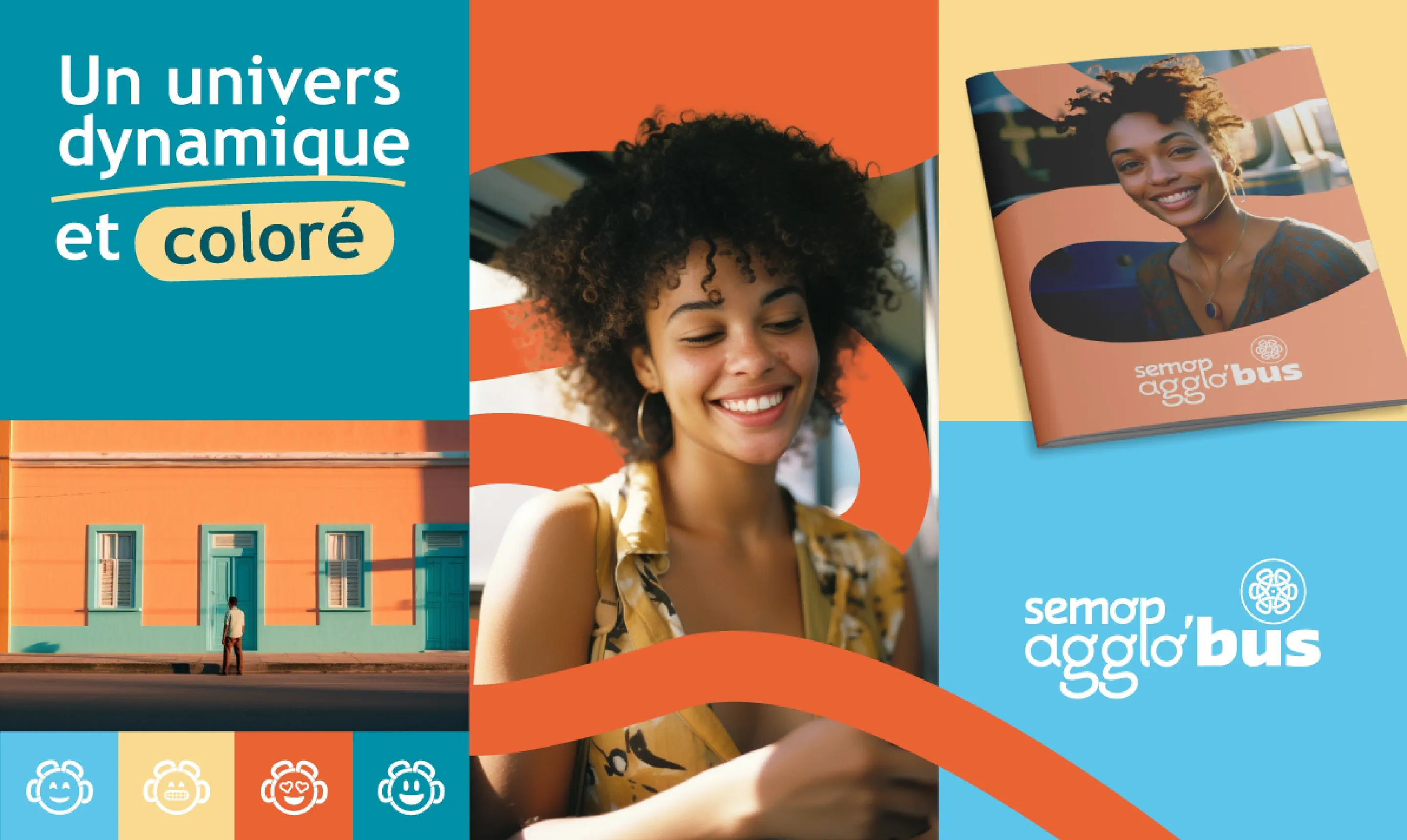 Nous avons conçu un univers graphique profondément ancré dans l'identité guyanaise, qui reflète une image de marque à la fois vivante et inclusive. Les couleurs chaudes et dynamisantes se mêlent à des nuances de bleu inspirées des bus Semop agglo'bus, créant un contraste harmonieux qui capte l'attention. La typographie, avec ses courbes douces et accueillantes, renforce le caractère accessible et ludique de l'ensemble, traduisant une approche inclusive et bienveillante. L'iconographie, quant à elle, s'articule autour de tracés dessinés à la main, alliant fluidité et rebond. Ces lignes évoquent le mouvement fluide des trajets de bus, dessinant les itinéraires avec légèreté. Enfin, l'univers photographique complète cette identité avec des captures spontanées de passagers, souriants et plongés dans leur quotidien. Ces visuels permettent aux voyageurs de se reconnaître dans l'image de marque et de se projeter dans une expérience de déplacement agréable et connectée à leur réalité.